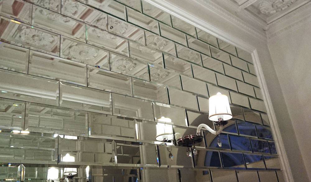 Зеркальные плитки можно монтировать с помощью зеркального клея или специальных двусторонних лент. Первый метод определенно более трудоемкий, но гарантирует длительный и точный эффект.