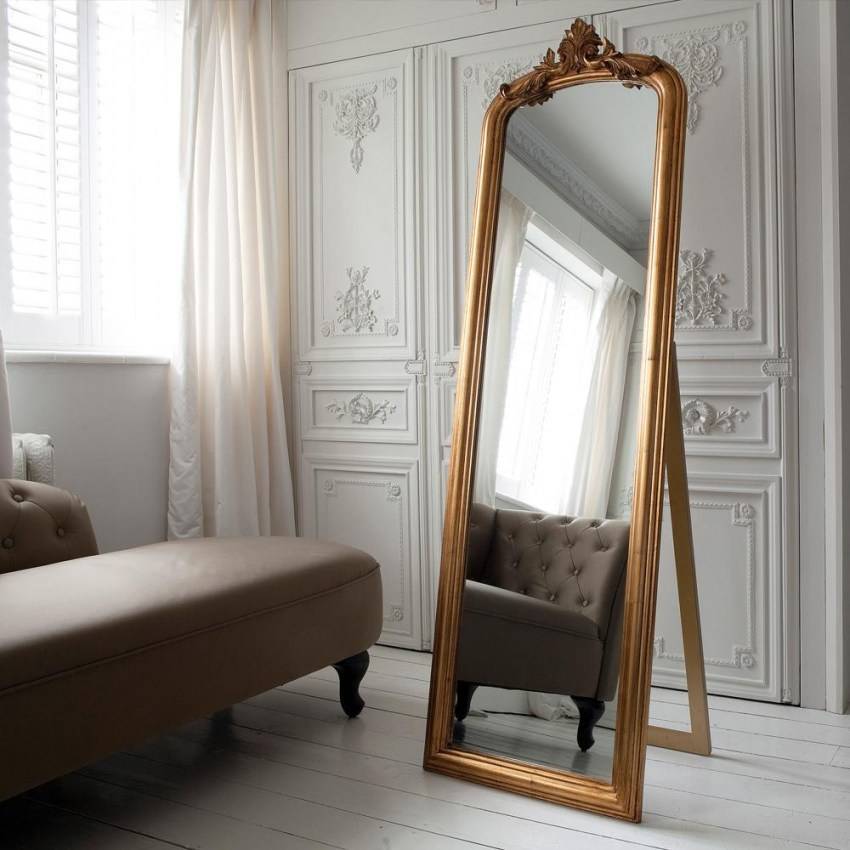 Такие зеркала в пол чаще всего имеют большие размеры и обрамлены широкой рамой. В гостиной их в основном размещают у стены или применяют специальную подставку.