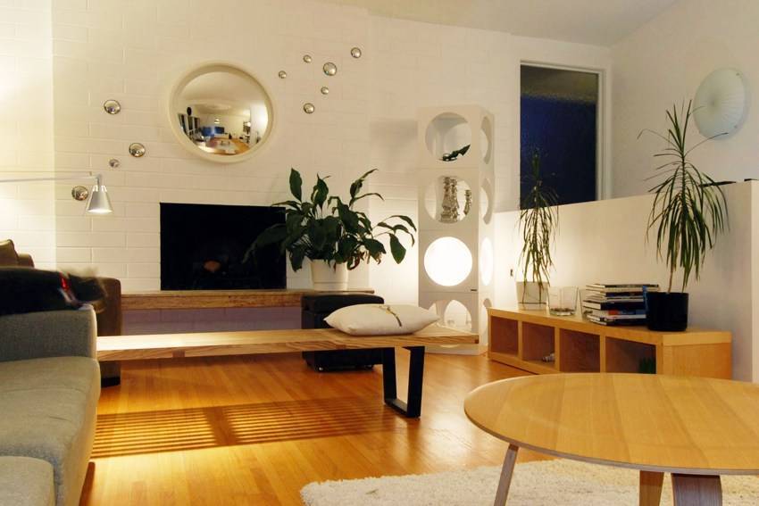 Здесь хороши круглые и горизонтально удлиненные зеркала, подвешенные с легким наклоном. Если комната темновата, попробуйте повесить на боковой стене большое зеркало. В интерьере оно отразит солнечный свет и направит его в отдаленные уголки помещения.