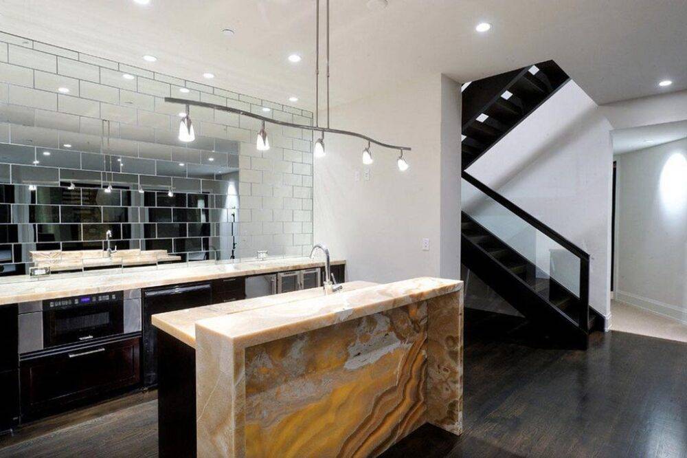 Кухня с зеркалом на стене в обеденной зоне может сделать ее светлее.