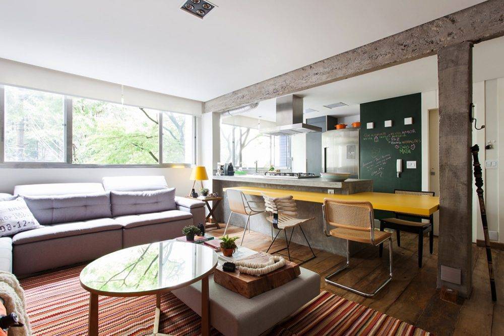 Современная квартире в стиле лофт со смешанным освещением, диктующим зоны помещения без перегородок. Круглый журнальный стол, четыре разнообразных кресла и грубый металлический напольный светильник образуют зону для чтения