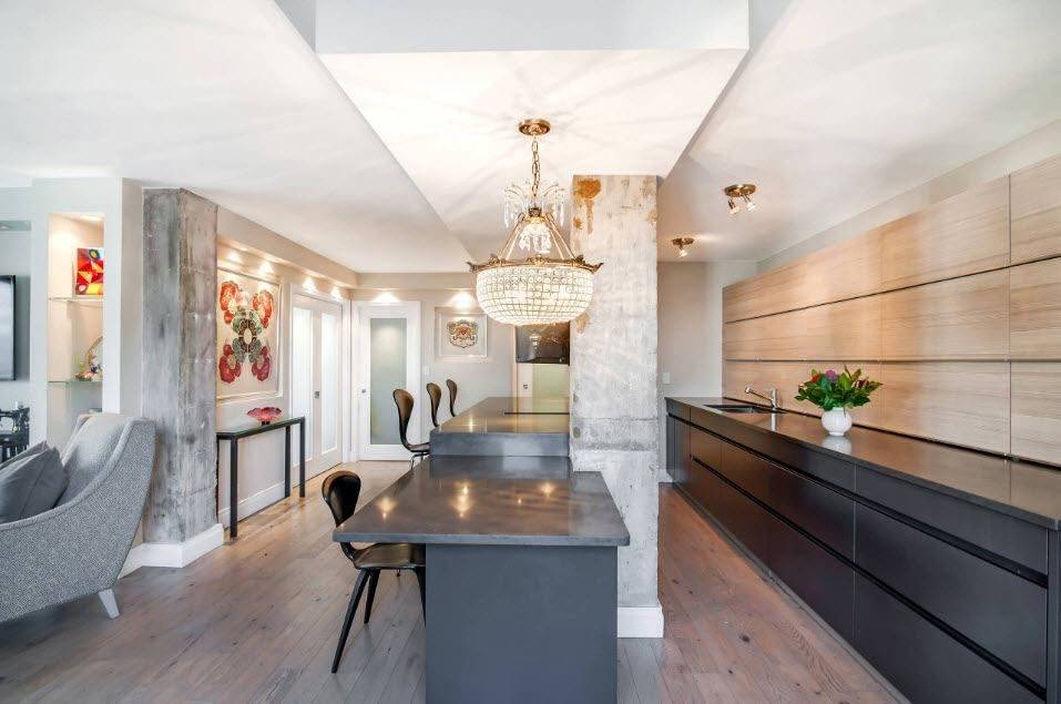 Контрастный световой дизайн современной кухни: трековые светильники с поворотным механизмом и классическая хрустальная люстра