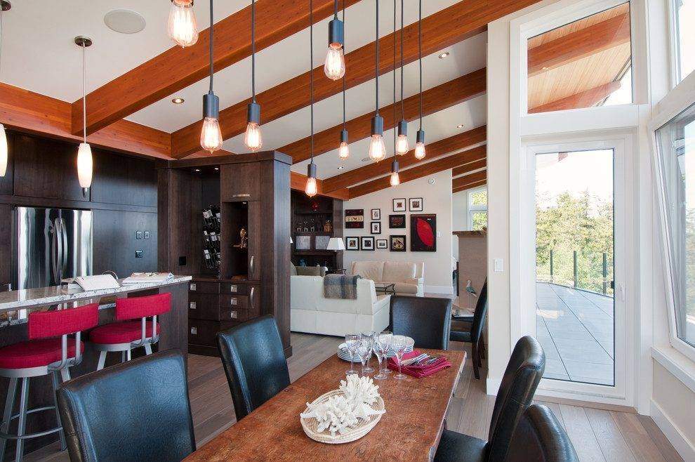 Подвесные лампы, прикрепленные к потолку, играют роль промышленного освещения всей комнаты или отдельных ее участков. Подвесное освещение очень подходит для подсветки кухонной зоны, особенно если это лампы с куполообразным абажуром.
