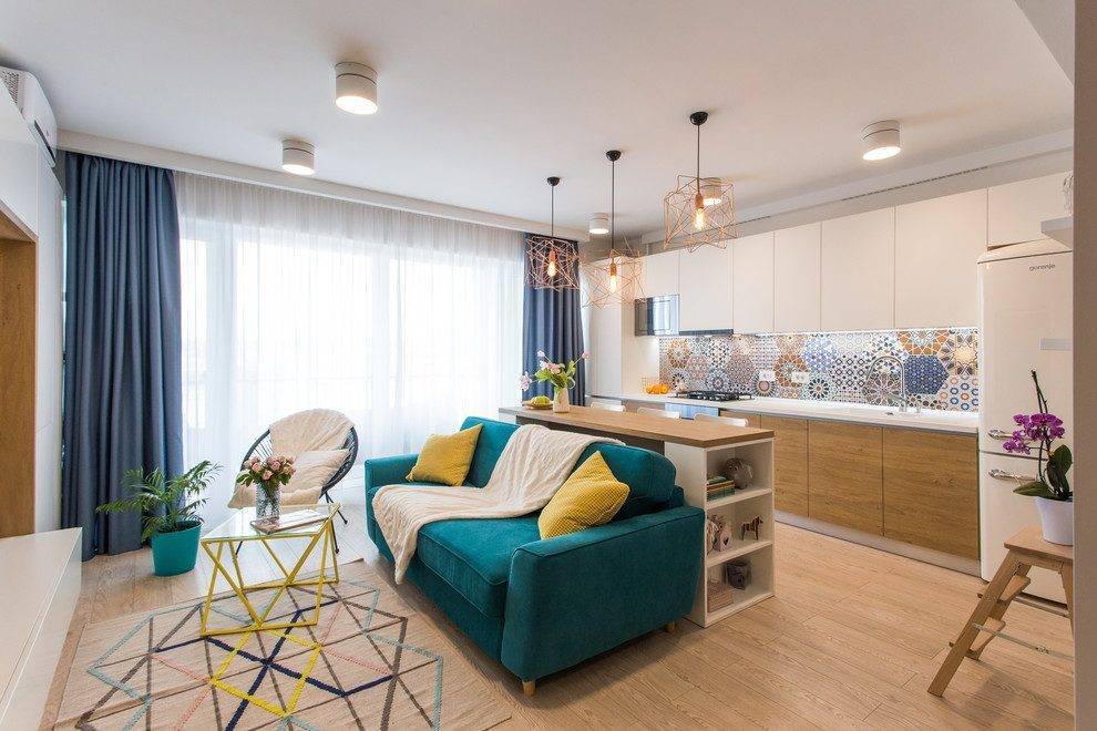 Яркая гостиная в стиле минимализм с зонированием без четких границ перегородок, а благодаря подвесному светильнику, напольному торшеру с регулирующейся высотой, ретро-лампам Эдисона