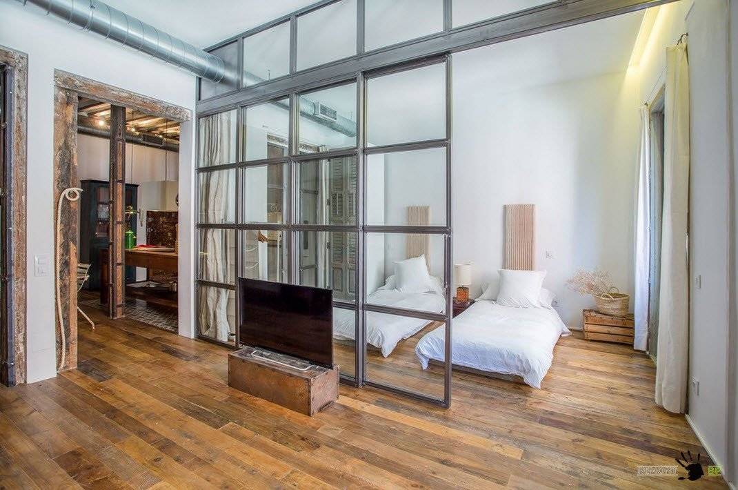 Еще одна спальня с двумя кроватями является частью просторного помещения, с которым мы уже знакомы – это гостиная, кухня и столовая. За стеклянной перегородкой с металлическим каркасом, сконструированной по типу промышленных ширм, расположилось два спальных места. Отделка этого пространства для сна и отдыха полностью продолжает эстетику остальных помещений – белоснежные потолок и стены, и деревянная напольная доска. Единственным отличием в оформлении личного пространства от общего можно назвать наличие штор, которые можно задернуть и придать комнате более уединенную, интимную обстановку.