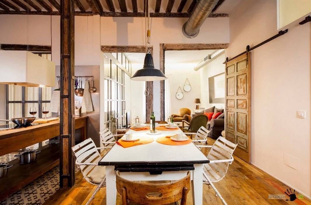 Сделав всего шаг из пространства гостиной, мы оказываемся в зоне столовой и кухни. Для организации семейных обедов и приема гостей с угощением установлен вместительный обеденный стол и стулья разной модификации. Старые металлические стулья, на которых частично облупилась белая краска и не менее «опытная» мебель из дерева завершают образ обеденной группы. Старинные вещи или предметы из натуральных материалов помогают приблизить индустриальную эстетику к тому, что мы часто понимаем под уютной и комфортной обстановкой – это мебель, текстиль и декор из нашего прошлого (или стилизованная под прошлое), все, что напоминает нам о беззаботном детстве.