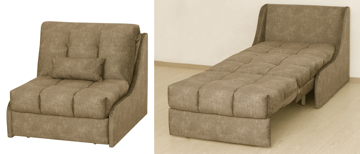 Раскладывается механизм легко: сиденье приподнимается и вытягивается вперед, а затем «разворачивается», давая возможность установить на пол ножки дивана. Спинка обычно остается неподвижной.