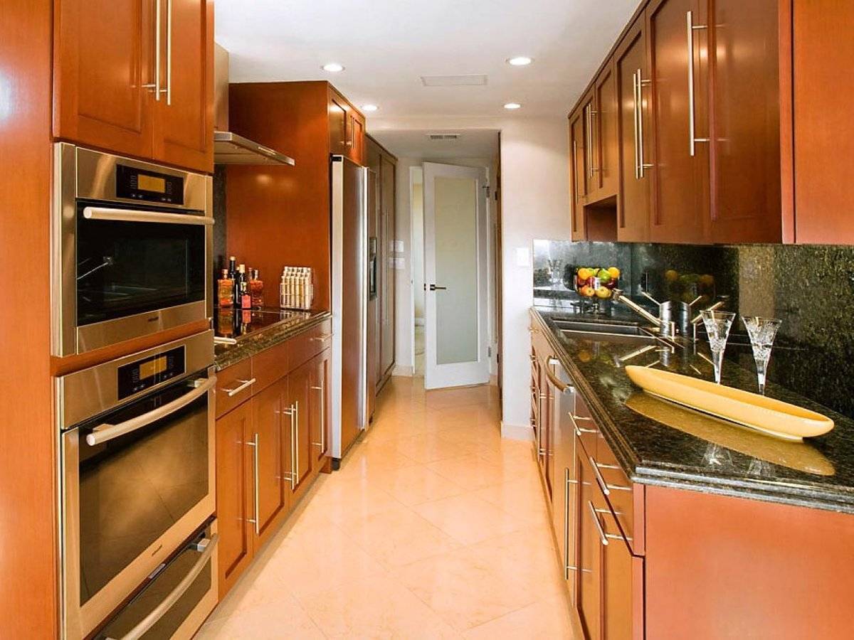 По обеим сторонам для удобства хозяйки равномерно распределяют бытовую технику, шкафчики. Мойку и холодильник можно установить у одной стены, а плиту — у другой. Стол для обеда находится либо в центральной части, либо возле окон, все зависит от размеров кухни.