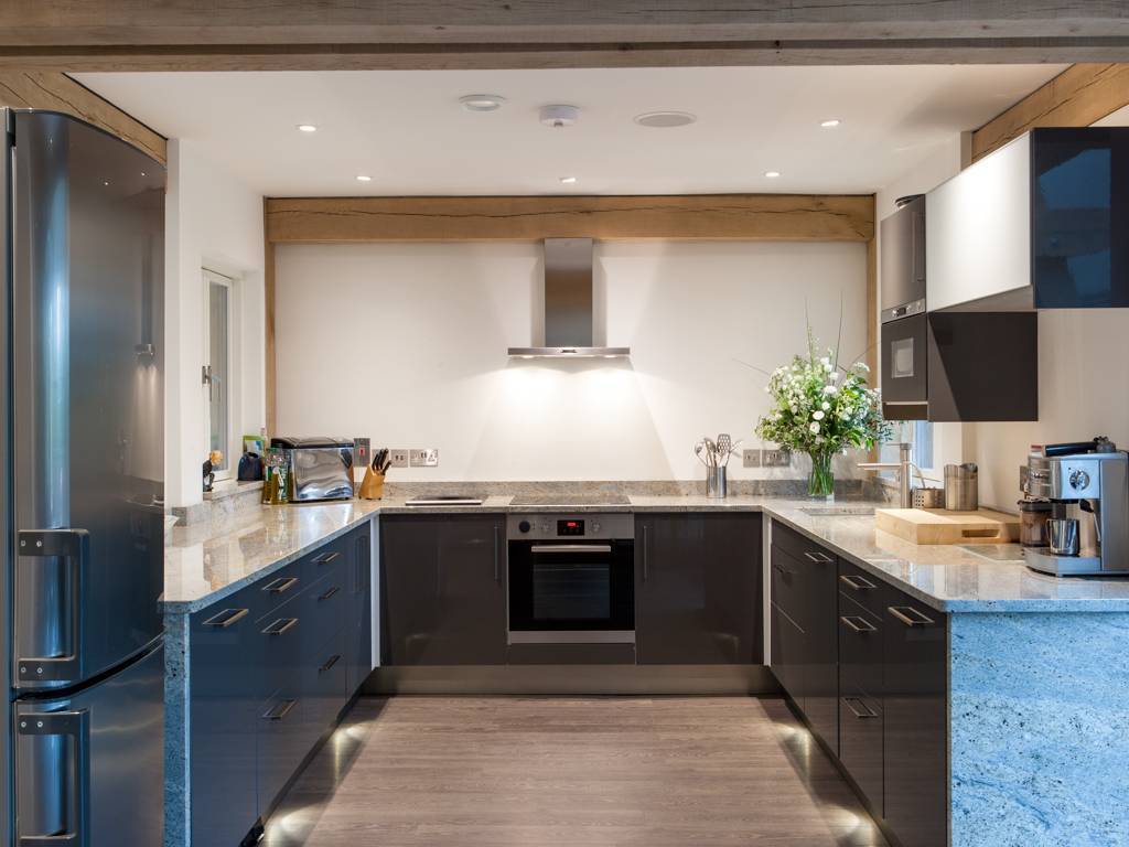 Удачным стилистическим ходом будет устройство камина или его имитации. В качестве узоров для отделочных материалов и текстиля хорошо подойдут геральдические мотивы, клетка, полоска, розы. Всю бытовую технику по возможности нужно встроить в гарнитур таким образом, чтоб она не бросалась в глаза.