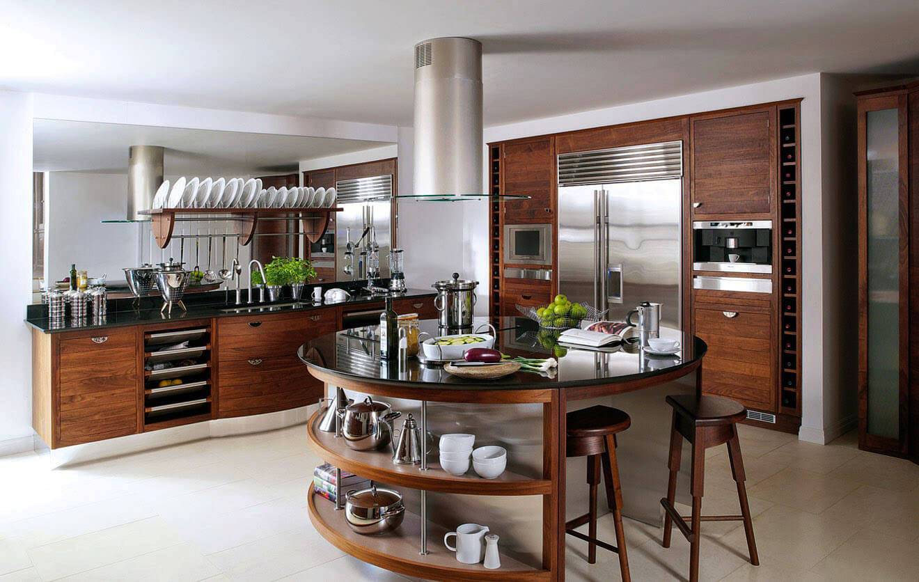 Неправильная конфигурация. Для кухни могут использоваться стойки различной формы: прямоугольной, круглой и т. д. Главное, чтобы линии повторялись в другой мебели кухни. Например, если стойка овальная, мебель можно расположить таким образом, чтобы тоже создавалась форма полукруга. Отличный вариант – сделать такую форму и на подвесном потолке или выложить соответствующим образом плитку на полу. На текстиле также могут присутствовать полукруглые линии и узоры. Если в барной стойке верхняя консоль плавно переходит к столешнице, то плавность должна быть и в других элементах кухни.