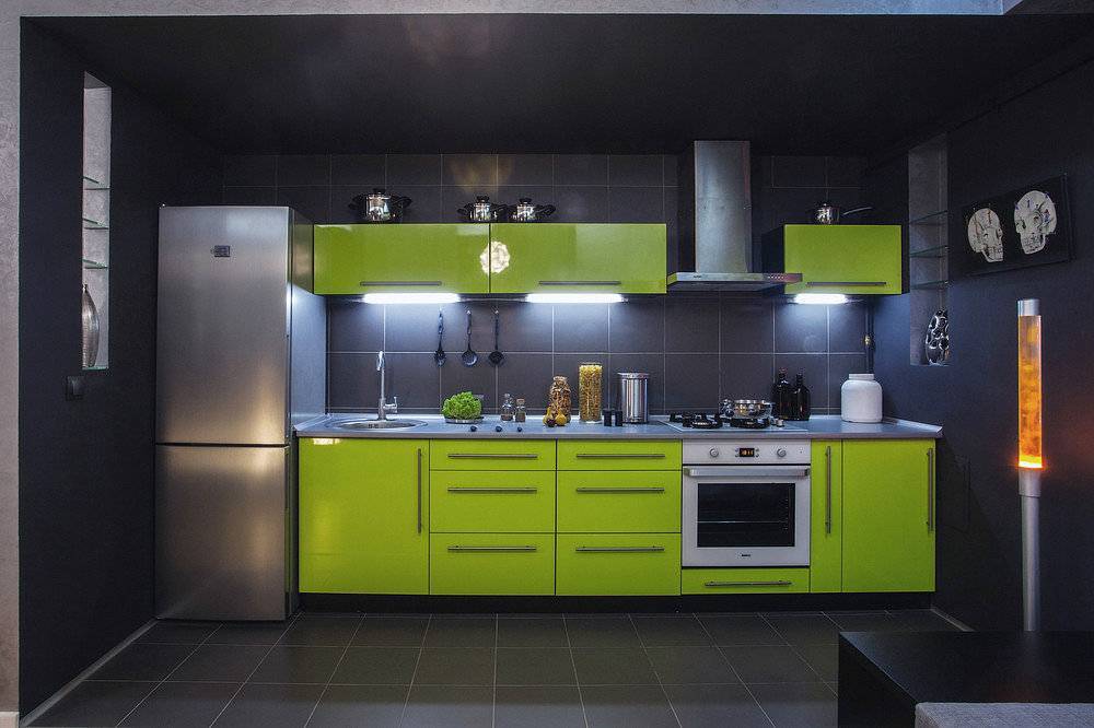 Линейная — чаще всего используют именно этот способ размещения мебели. Он идеально подходит для узких кухонь, но также приемлем в квартирах-студиях, помещениях совмещенного типа. Неудобство заключается в том, что основные зоны (холодильник, варочная панель, раковина) расположены в один ряд. Линейным способом можно разместить шкафчики, навесные секции, тумбы, стеллажи, полки.