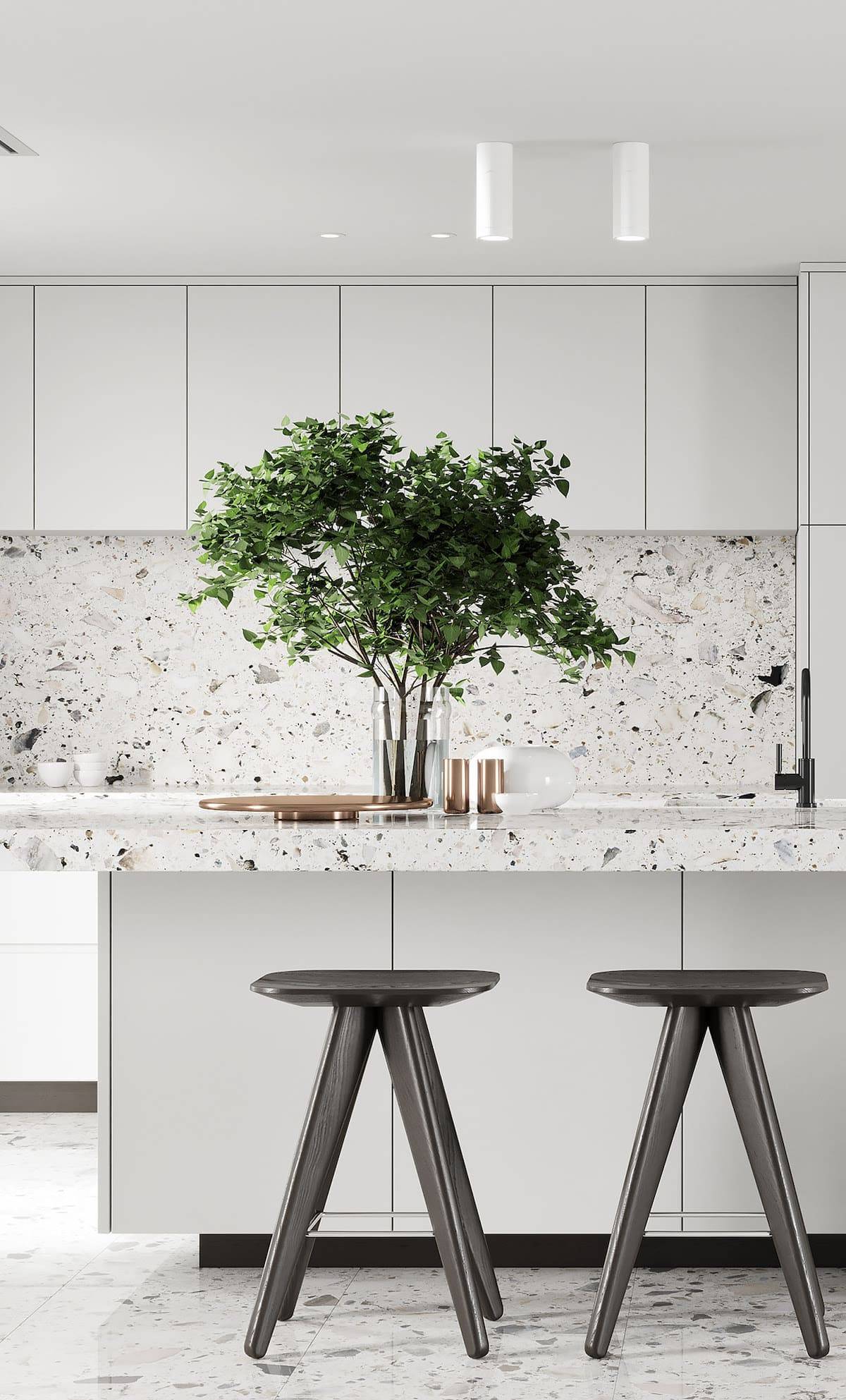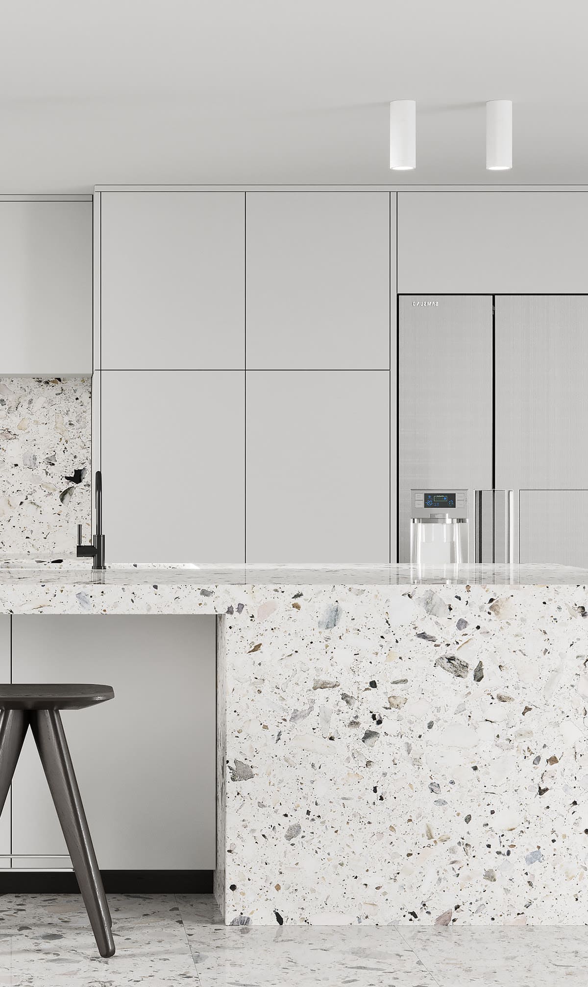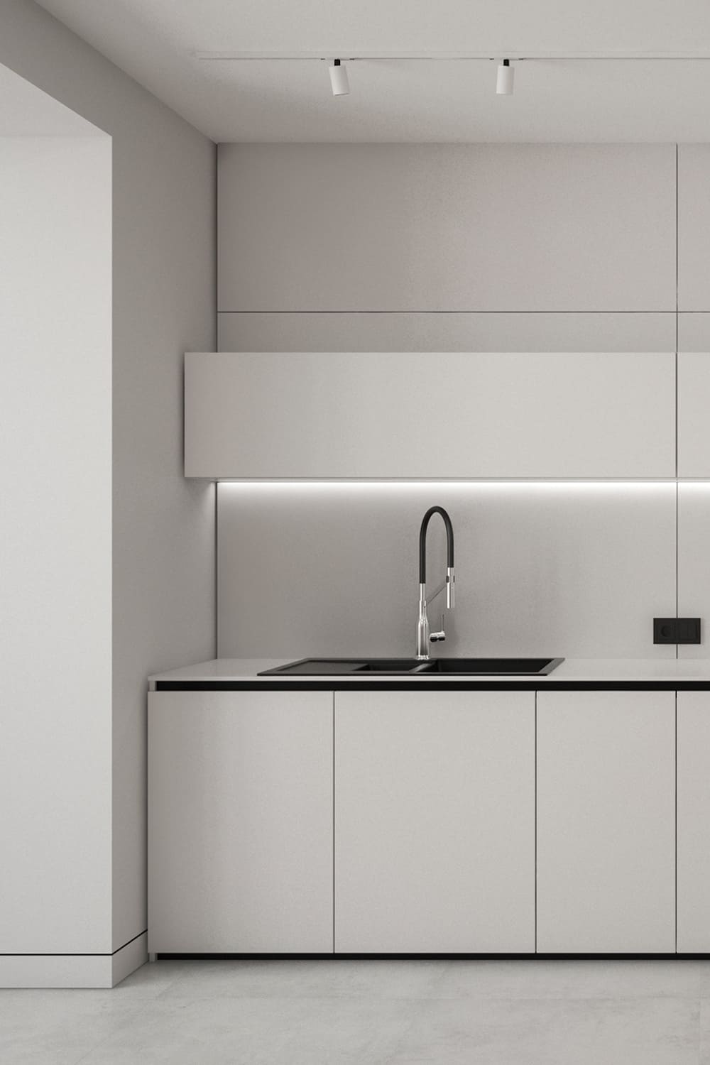 Монохромный серый в сочетании с белым и черным образует аскетичное пространство, которое не нуждается в дополнении яркими деталями. Единственным его украшением могут служить сложные фактуры под дерево, камень, мрамор и другие природные поверхности. Чтобы не нарушить порядок и строгость минималистичной кухни, лучше отдать предпочтение фасадам с интегрированными (скрытыми) ручками.