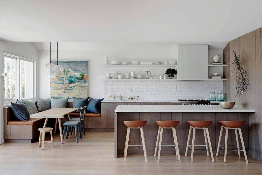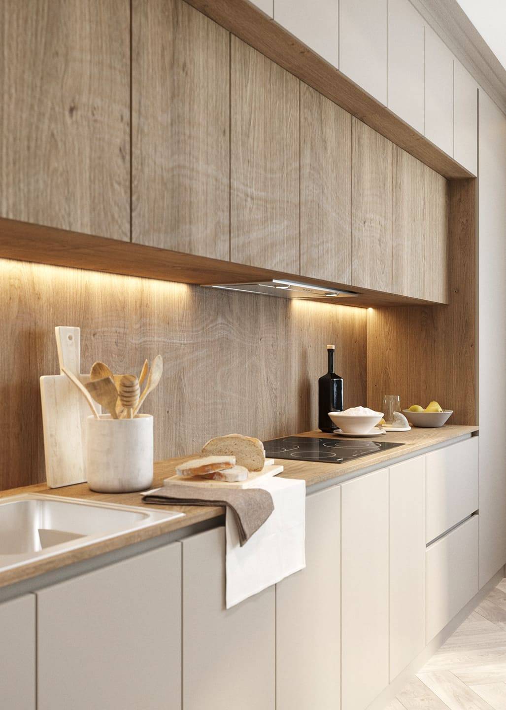 Не бойтесь использовать натуральные текстуры, для них нет ограничений. Это так же могут быть столы, стулья, элементы на шкафчиках — и ваше времяпровождение на кухне будет приятным и положительным.