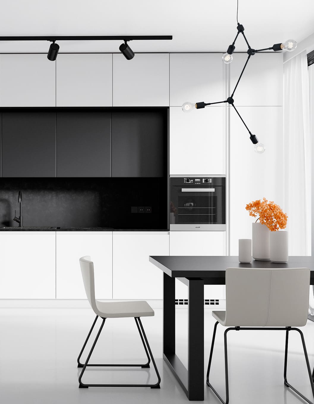 Черно-белая кухня, фото которой вы видите, – идеальный вариант для тех, кому не по душе яркие вкрапления в белоснежный кухонный мир. Такое сочетание всегда в фаворе моды, и в самых популярных стилях оформления дизайнеры отдают столовой зоне белые оттенки, а рабочему участку черные.