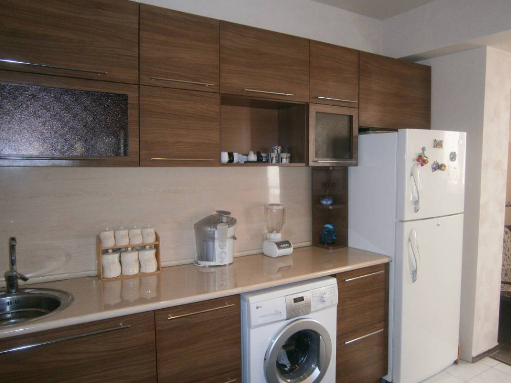 Кухня средних размеров неплохо смотрится в кремовом цвете. При этом не обязательно, чтобы отделка стен соответствовала фасаду гарнитура. Она может иметь некоторый контраст. Что касается столешницы, то здесь не обходятся без натурального красного камня. Из этого же материала изготавливается и врезная раковина.