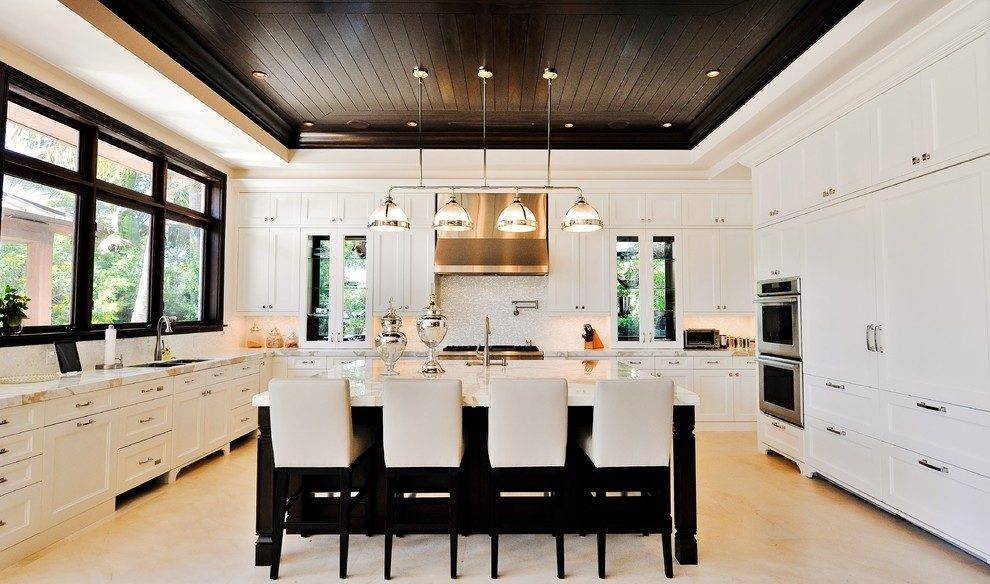 Потолок на белой кухне 2022 можно просто побелить или сделать фактурным, украсив выразительной лепниной на контрасте, которая будет сочетаться с другими акцентами в общем ансамбле. Можно покрыть потолок сусальным золотом или серебром, декорировать плиткой, пластиковыми или металлическими пластинами.