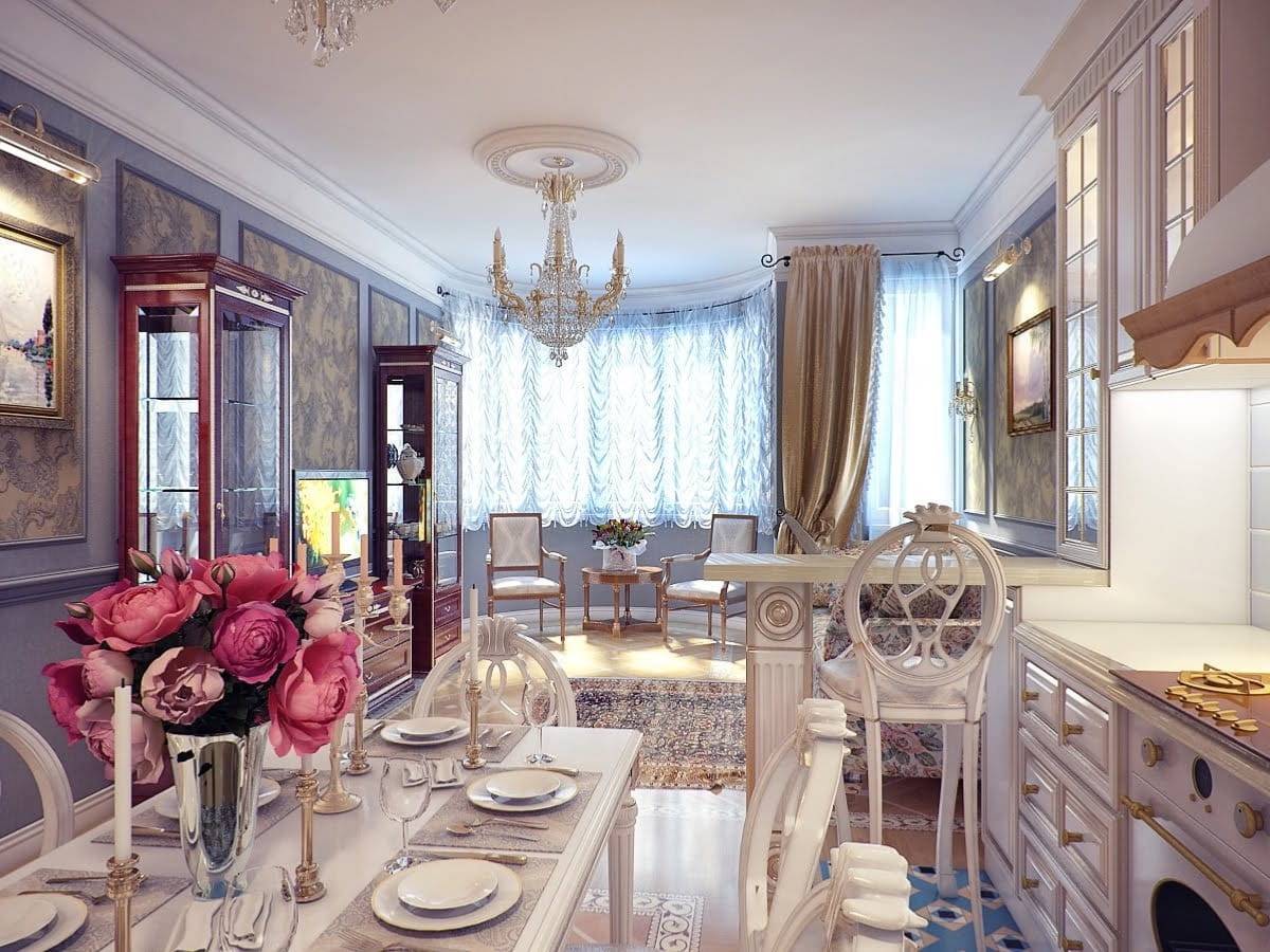 Классическая кухня в молочном цвете с декоративными накладками неплохо смотрится с подсветкой в полках и открытых посудных шкафчиках. Минус таких гарнитуров в том, что на внутренних поверхностях быстро скапливается пыль. Кафельный пол под мрамор подчеркивает общую обстановку. Обеденная зона — круглый стол с белоснежной скатертью и стульями.