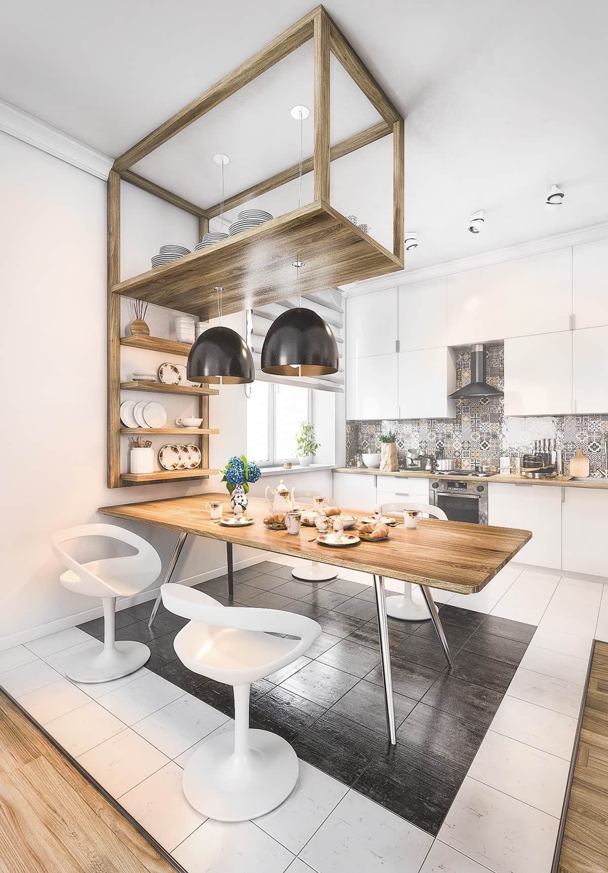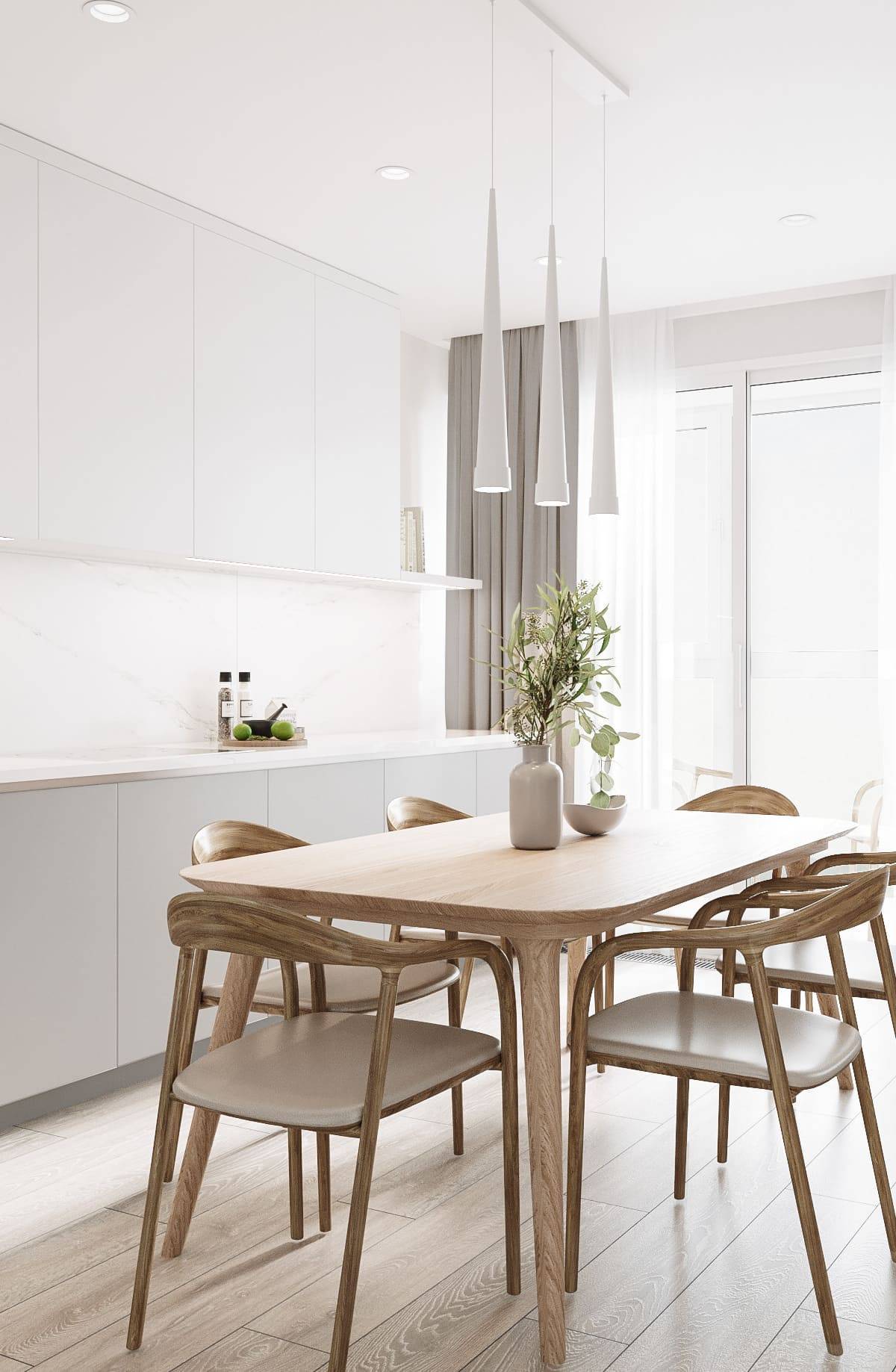 В интерьере белой кухни 2022 будут отлично смотреться стол со стульями из массива дерева или цветного стекла.
