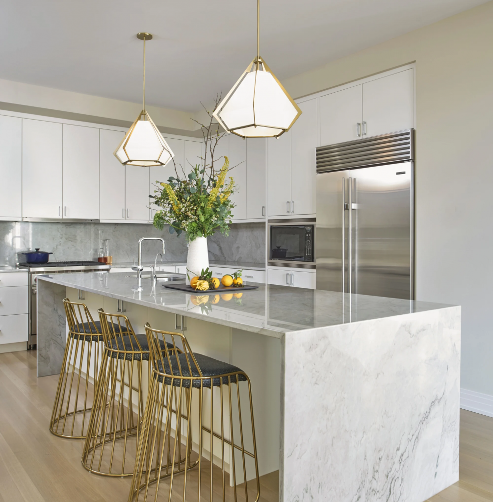 Изящное обустройство для габаритных кухонь стараются организовывать с применением фактурного натурального камня. Например, облицовывают столешницы рабочей зоны или барной стойки мрамором либо гранитом.