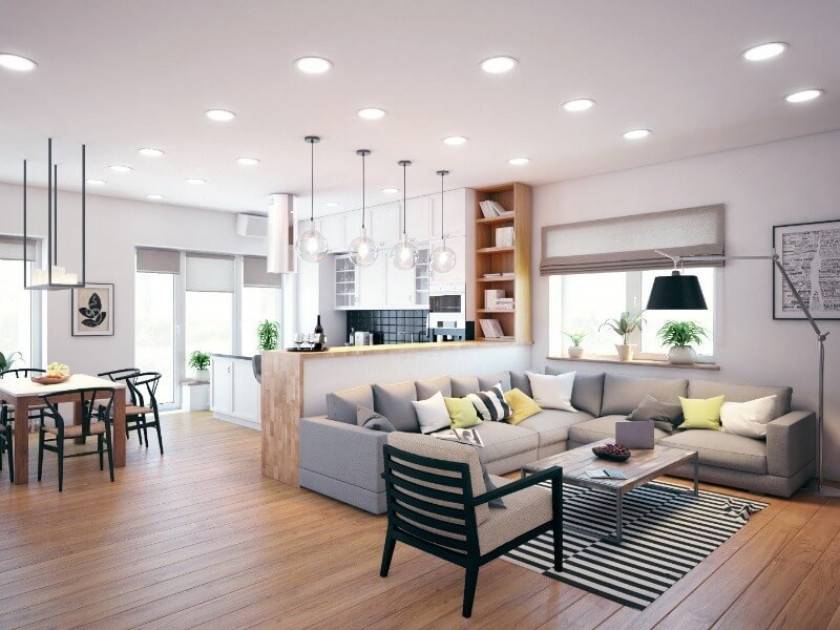 Очень удобно отделить рабочую зону кухни от зала установкой барной стойки, обеденного стола или дивана. В некоторых случаях уместно организация стационарной или передвижной перегородки. Все эти приемы разделят квартиру на две зоны, каждая из которых выполняет свои функции, а визуально помещение будет выглядеть просторно и уютно.
