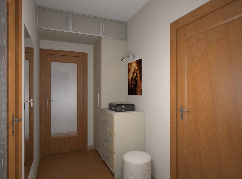 - антресоли выше уровня головы вдоль проходов и небольшой узкий шкаф в прихожую в угловом пространстве;