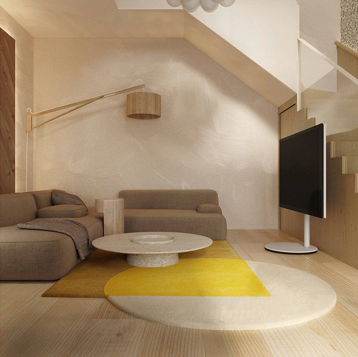 Гостиная в бежевых тонах – классический вариант. Светло-коричневый соседствует с желтоватым и серым. В бежевом исполнении и большой мягкий диван. Яркие «пятна» в лице ярко-желтого кресла, подушек и картин готовы насытить спокойную обстановку модерна. Напротив софы ─ плазменная панель. Гостиная не имеет отдельного входа. Входить в зону отдыха можно через кухню либо спустившись по лестнице со 2-го этажа.
