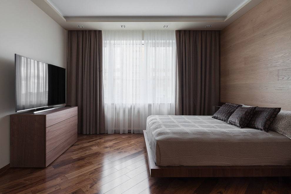 В этом случае также важно обеспечить комфортность передвижения в комнате и не заполнять спальное пространство посторонними предметами. Также, если метраж спальни позволяет, можно расположить кровать и перпендикулярно самой длинной стене — это визуально выровняет форму комнаты