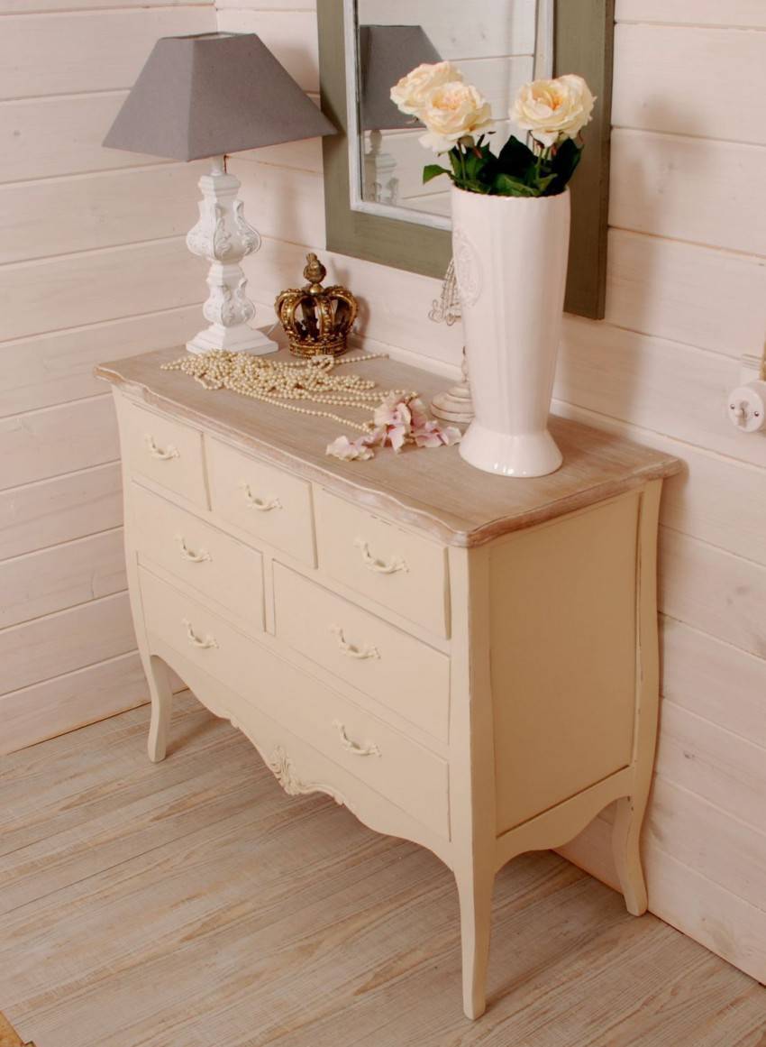 Комоды. Они выдерживаются в разных цветовых решениях, начиная от белых, голубых, и заканчивая розовыми. Комоды могут быть как изящными, так и большими по размерам. Они имеют оригинальные изогнутые ножки, потертые поверхности, и часто запираются на замки.