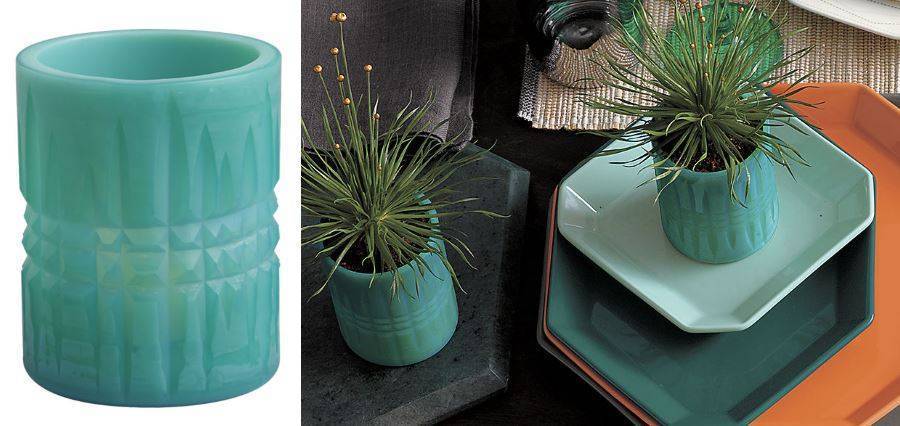 Вазы с поверхностью блестящей, как бегущая вода, такого же холодного «аквамаринового» цвета на изображении ниже оживят вашу комнату.