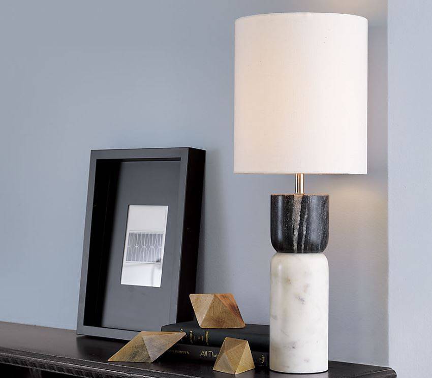 Мрамор и дерево – удивительное и красивое сочетание. Геометрические фигурки из дерева, лаконичная чёрно-белая красивая настольная лампа впишутся в любое оформление.