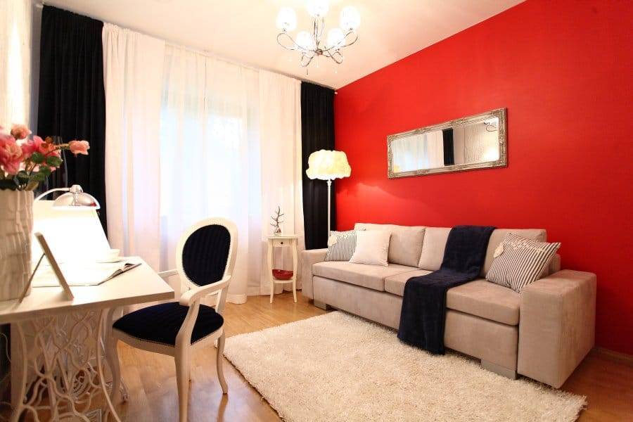 На фоне красного или другого цвета акцентом можно сделать мебель в интерьере помещения. Красный требует много пространства, в небольших комнатах лучше использовать один предмет мебели этого цвета.