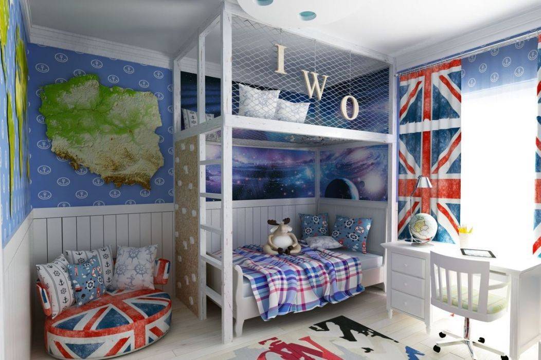 Красный, синий и оттенки белого часто используют для создания тематических интерьеров (особенно популярно такое сочетание для детской). Например, сочетание белого, лазурного и терракотового – это классика морского или пиратского стиля. Если оттенок синего будет напоминать ночное небо, то можно создать “космический” интерьер. Наконец, вспомните про английский флаг, который состоит именно из этих двух цветов. Поэтому современный интерьер на национальную британскую тематику базируется на сине-красном сочетании, как показано на фото, ниже.