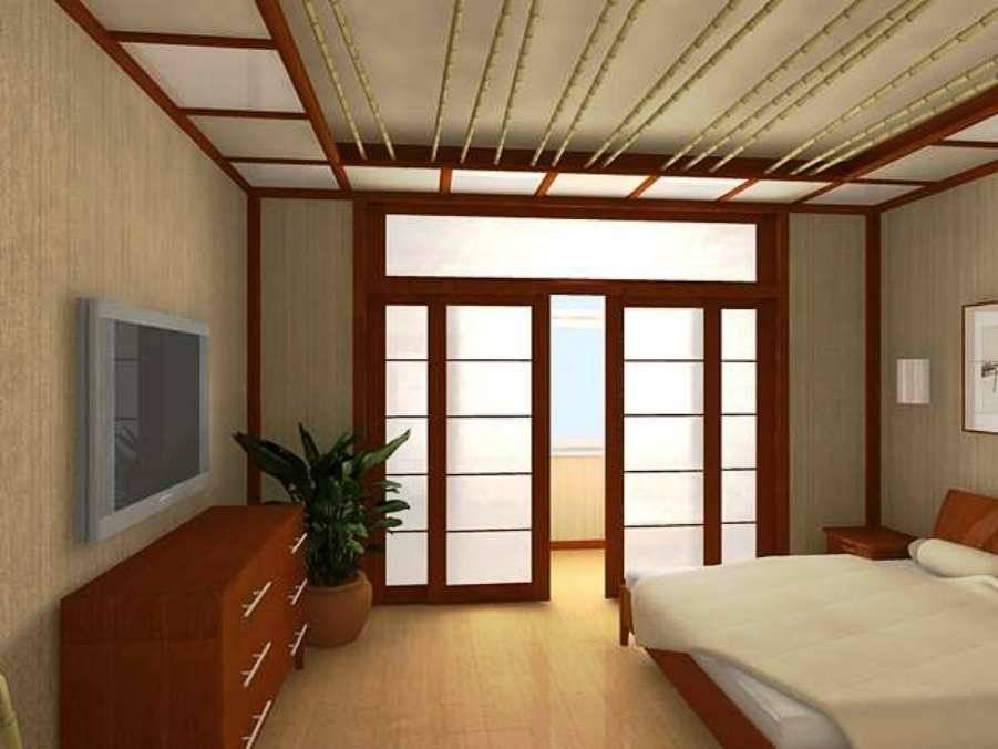 Потолок оформляется в том же цвете, что и стены. Он должен быть ровным и однотонным, поэтому для отделки оптимально использовать натяжные потолочные полотна. Причем глянцевые и зеркальные потолки в японском стиле – это нонсенс, как и картины на потолочном покрытии. Ровный матовый потолок в цвет стен – лучшее решение для оформления жилья в этностиле «Страны Восходящего Солнца».