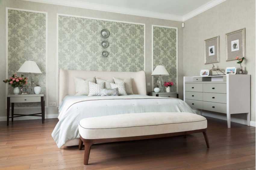 Для классики характерно сочетание античных мотивов и элементов эпохи Возрождения. Поэтому витиеватые завитки, крупный цветочный орнамент, изображения херувимов, полосы в традиционном английском стиле – это то, что гармонично впишется в интерьер спальни в классическом стиле.