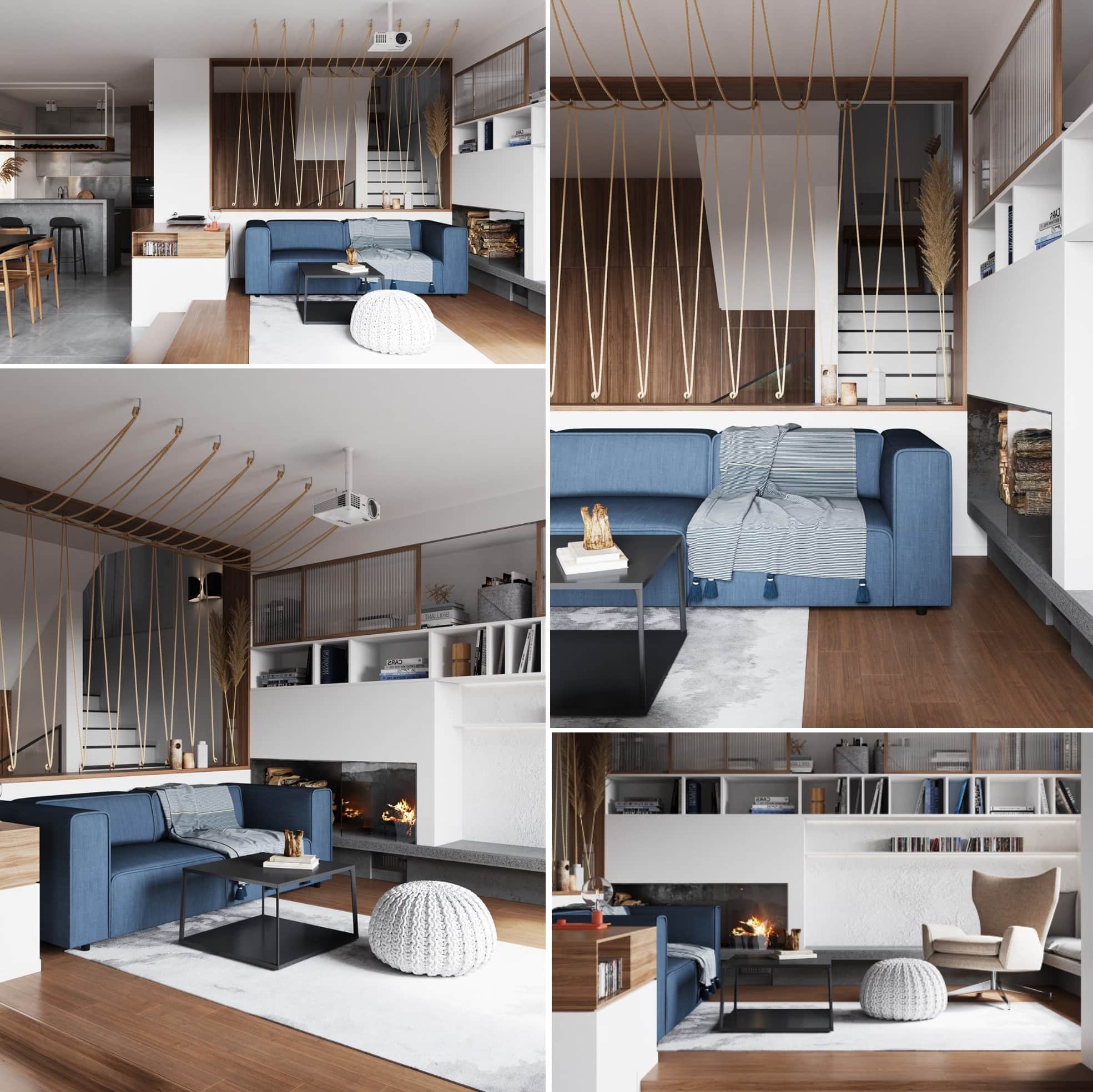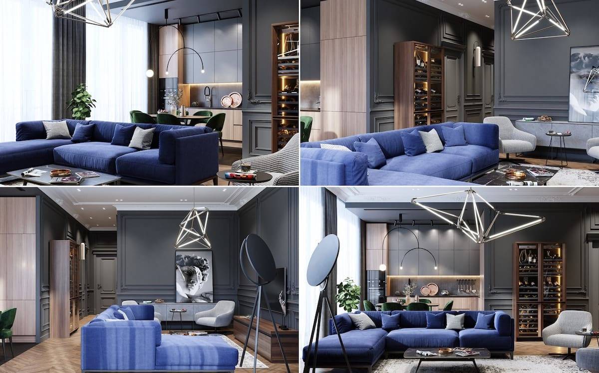 Интересная задумка оформления просторной гостной с обилием синего цвета