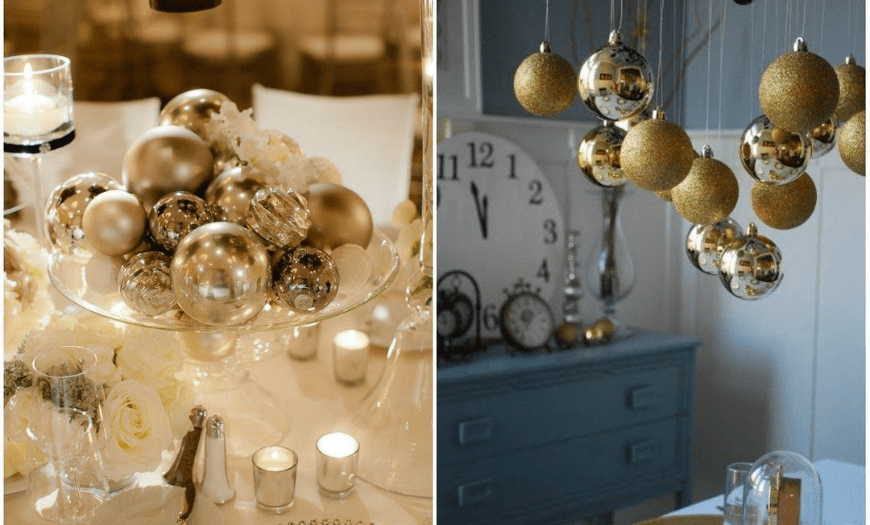 Новогодние игрушки к празднику покупают либо делают своими руками. Даже елочные шары можно изготовить самостоятельно, использовав их в качестве абажуров на лампу. Для этого воздушный шар обматывают блестящими нитками (люрексом), оставив небольшую пустоту около кончика для надувания. Затем конструкцию смазывают клеем ПВА, дают высохнуть. После изъятия резиновой оболочки остается блестящий большой шар, который можно также вешать в комнате или на елку.