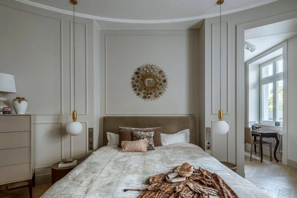 Золотистые нотки придают интерьеру утонченную гламурность, а ахроматическое дополнение позволяет уравновесить все составляющие окружающего пространства, сделав его сдержанным и элегантным.