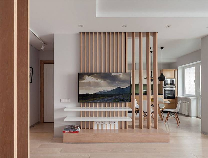 Ширмы из реек занимают меньше места, чем дополнительная стена, сквозь них проходит свет, поэтому не возникает ощущения тесноты. Их можно располагать в пространстве разными способами, в зависимости от общей геометрии помещения, при этом монтаж не требует серьезных ремонтных работ и выполняется довольно быстро.