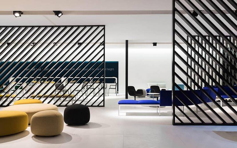 Такой дизайнерский ход подчеркивает важность зоны у входа, а также привлекает внимание к бренду, логотипу компании