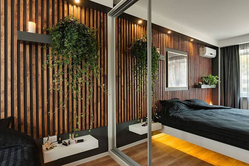 Эта комната нуждается в природном, мягком и теплом материале. Декор из тонких древесных планок спокоен и гармоничен. Монотонное чередование линий помогает расслабиться и уснуть. Рассмотрим, какие бывают спальни в реечном оформлении.