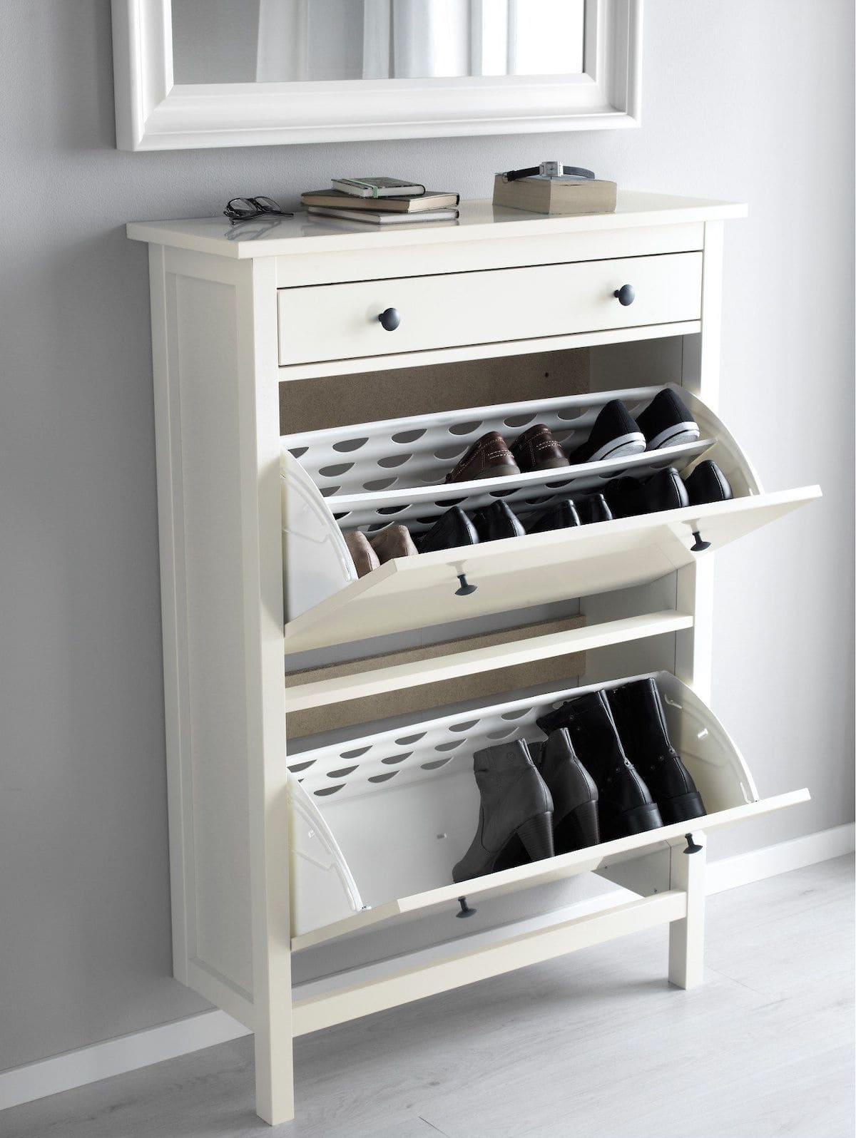 Закрытые обувницы в этом плане выигрывают, но их слабым местом являются их створки, а точнее фурнитура для обувницы. Если в конструкции использованы некачественные материалы, то такие механизмы для обувниц не прослужат вам долго.