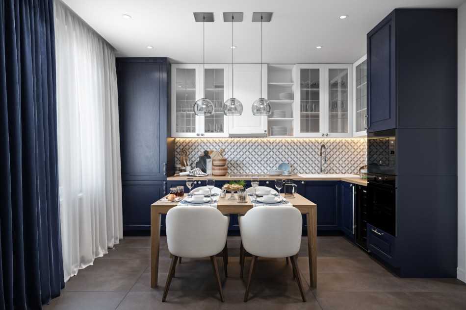 Кухня должна быть гармоничной и стильной. В оформлении приветствуют белый, бежевый, серый, зеленый, желтый цвета. От ярких оттенков лучше отказаться. Интересный вариант – кухня в морском стиле.