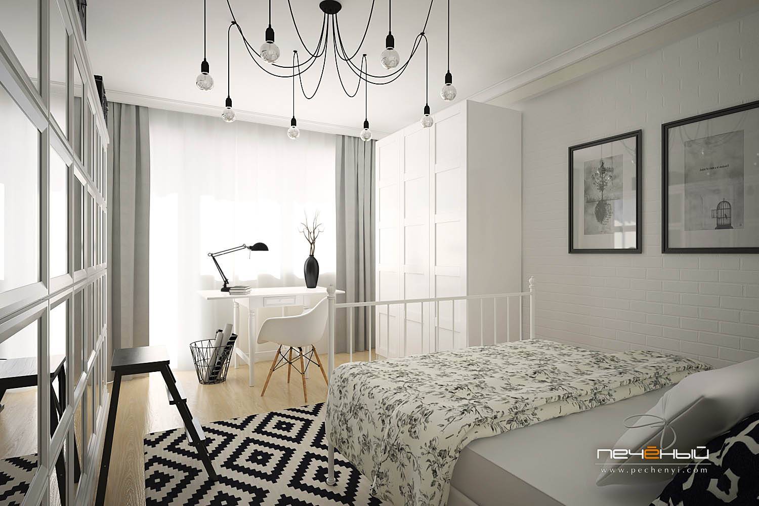 Современное скандинавское оформление выполняют в чёрно-белом цвете. Чёткие линии создают контраст на белом фоне, позволяя визуально корректировать геометрию комнаты. Активно используют серый оттенок.