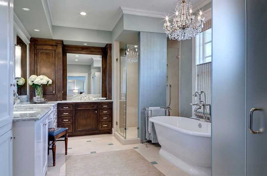 Ванная в классическом стиле выглядит уютной и комфортной, потому что при её оформлении используются качественные, преимущественно натуральные материалы и изысканные предметы декора.