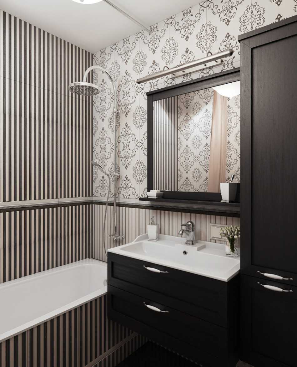 Сочетание белого и черного цвета в интерьере ванной комнаты выглядит красиво
