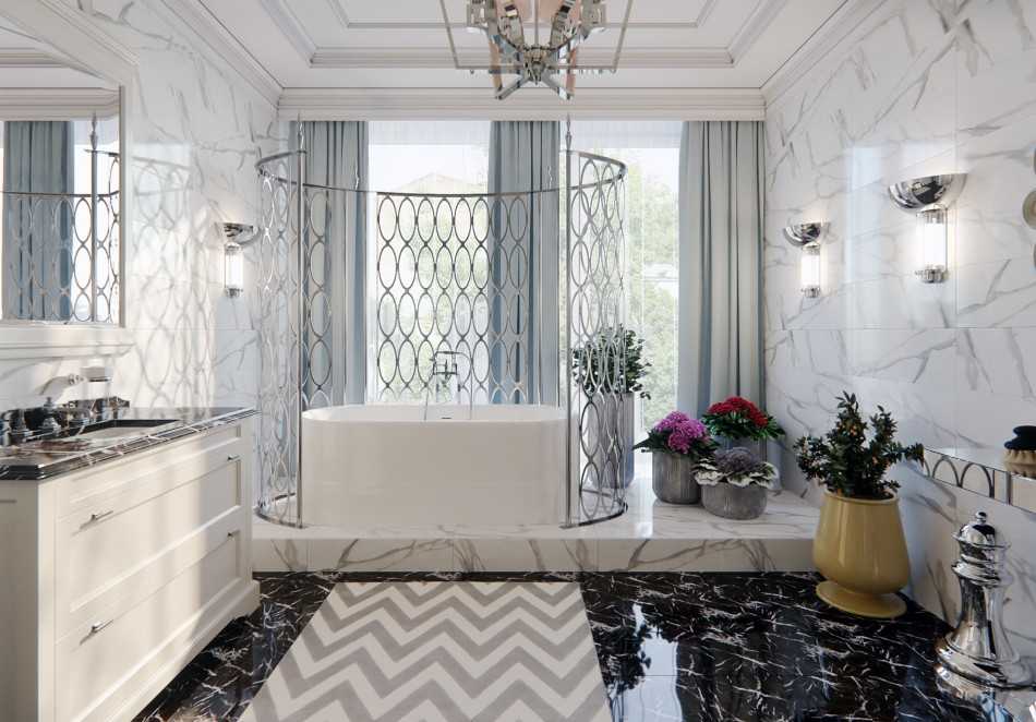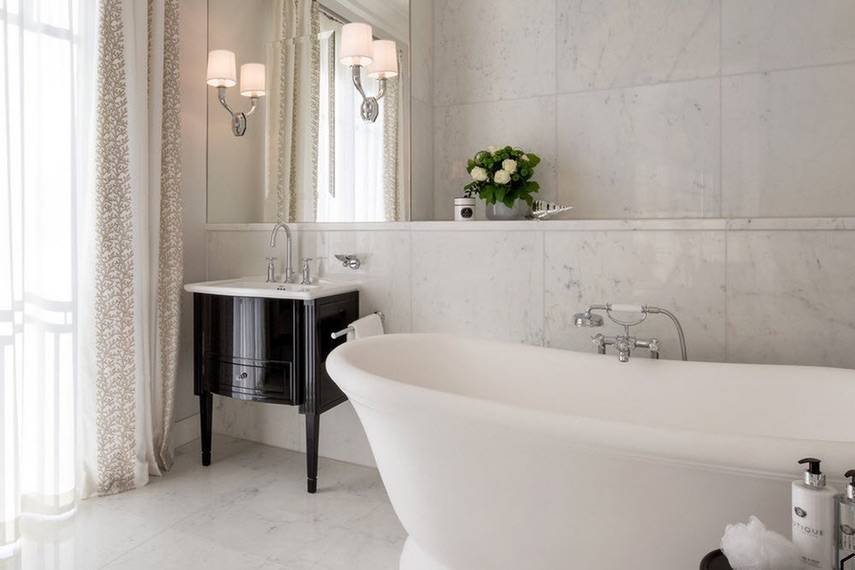 Пол. Варианты: преимущественно используют натуральный мрамор или керамическую плитку под мрамор; реже — наборной паркет и наливной пол. Пушистый коврик на полу усилит атмосферу уюта.
