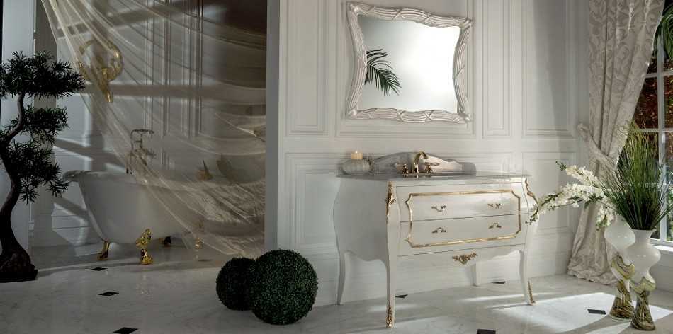 Деревянная мебель поддерживает классический стиль и декорирована в соответствии с итальянскими, английскими или французскими традициями классицизма. В интерьере французской классической ванной комнаты мебель светлая, от белого до слоновой кости, с позолоченной фурнитурой. В итальянской классике – насыщенные теплые оттенки дерева, красный, черный и молочно-белый лак, позолота, инкрустации. В испанской – фактурные филенчатые фасады цвета мореного дуба, темная патинированная фурнитура.