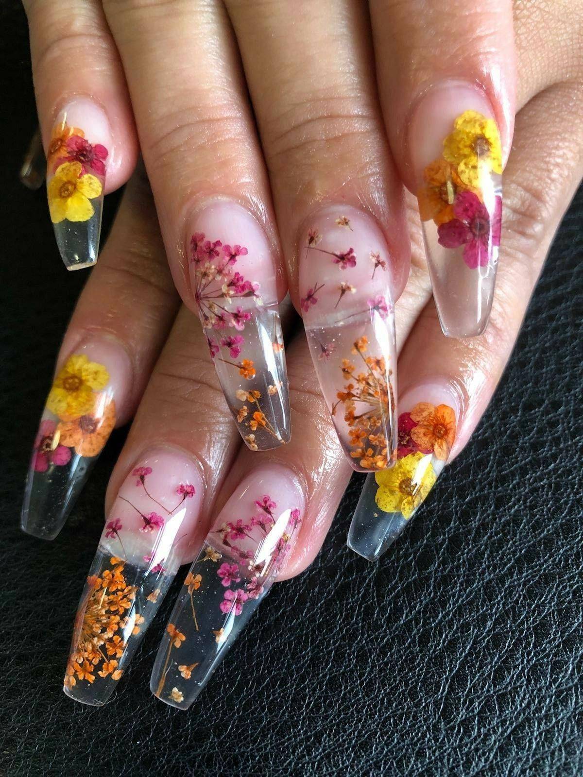 Одним из наиболее оригинальных аквариумных маникюров считается вариант дизайна, в процессе создания которого используются сухоцветы или гербарий – высушенные и окрашенные в разные цвета всевозможные веточки, цветочки или листики миниатюрного размера. Основой для такого декоративного материала выступает прозрачная или цветная основа, а в качестве дополнения можно использовать блёстки глиттера, фрагменты фольги или небольшие камни. Декор может располагаться по ногтевой пластине хаотично или в виде определённого узора. В этом случае всё зависит от желания и вкусовых предпочтений барышни.