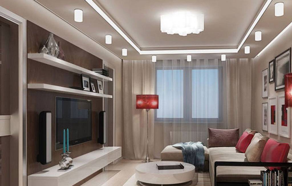Когда зал служит только для семейного общения и просмотра ТВ, в комнате можно установить центральный светильник интересного дизайна, неяркое светодиодное освещение по периметру и торшер возле дивана и кресел.