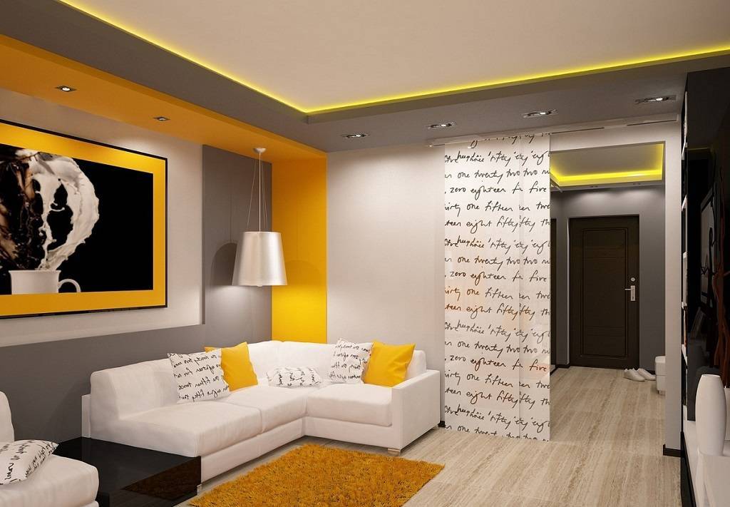 Создать комфортную обстановку в маломерном зале, да еще и совмещенном с кухней, без использования некоторых хитростей будет сложно.